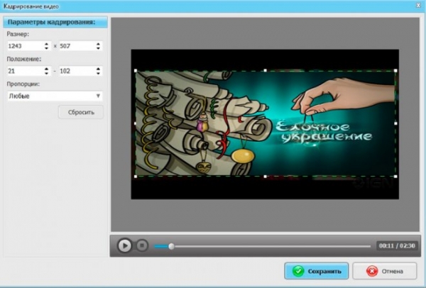 • Удалите вотермарк с помощью опции кадрирования. Для этого расположите зеленую рамку на ролике таким образом, чтобы водяной знак не попадал в выделенную область.
