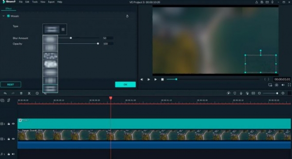• Определите степень интенсивности и параметры маскирующего фильтра — можно сделать размытие, пикселизацию или мозаику. Если размытый лого все равно лишний, то кадрируйте видео, обрезав водяной знак.