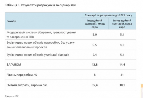 Нагадаємо, що у 2015 році Група Світового Банку розробила сценарії розвитку галузі поводження з твердими побутовими відходами. Для досягнення за 10 років рівня перероблення 41% (як в ЄС) потрібно 14,4 млрд €. Цікаво, що майже такий самий обсяг інвестицій – 13,8 млрд €, потребує і інерційний сценарій (тільки 8% перероблення).